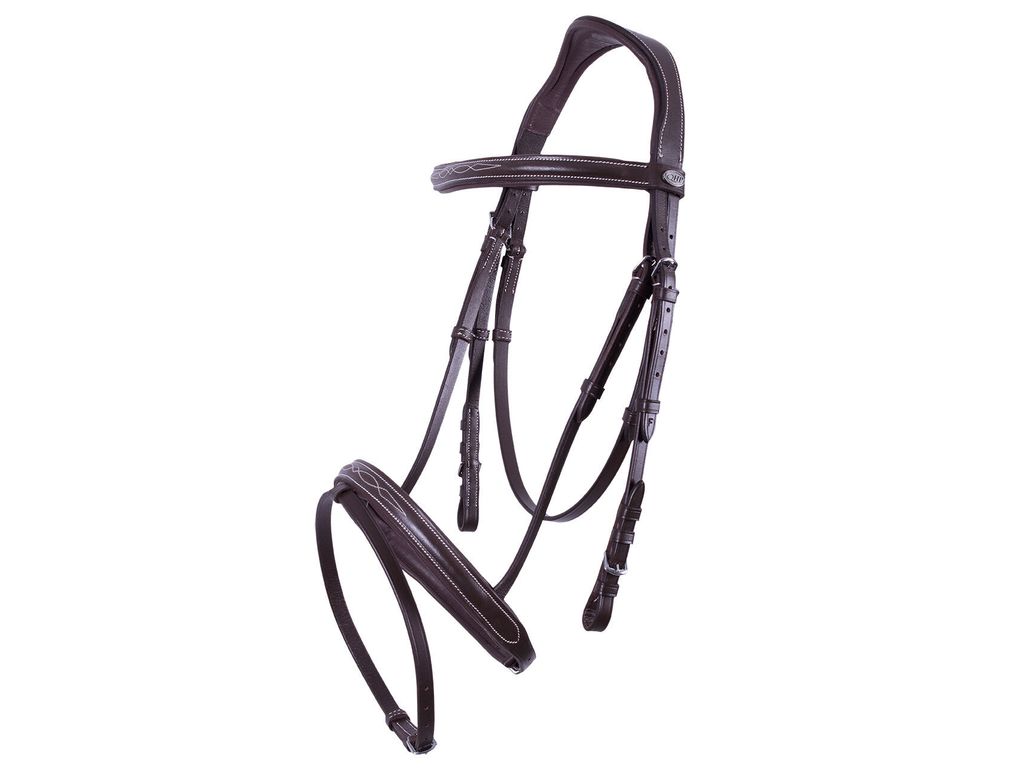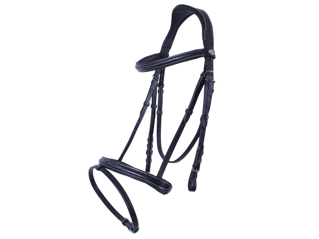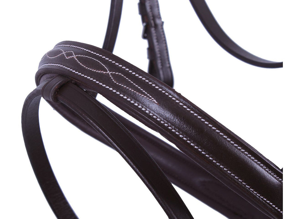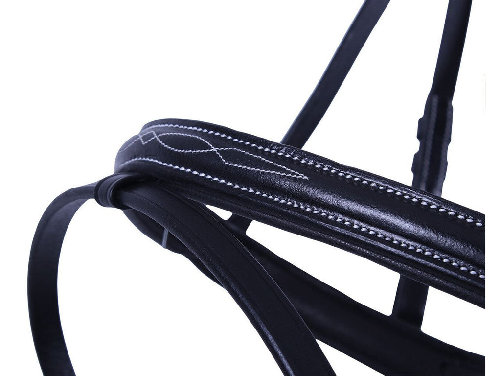 Versehen mit weißen Ziernähten auf  Nasen- und Stirnriemen für eine klassische Ausstrahlung. Versehen mit silbernen Verschnallungen.