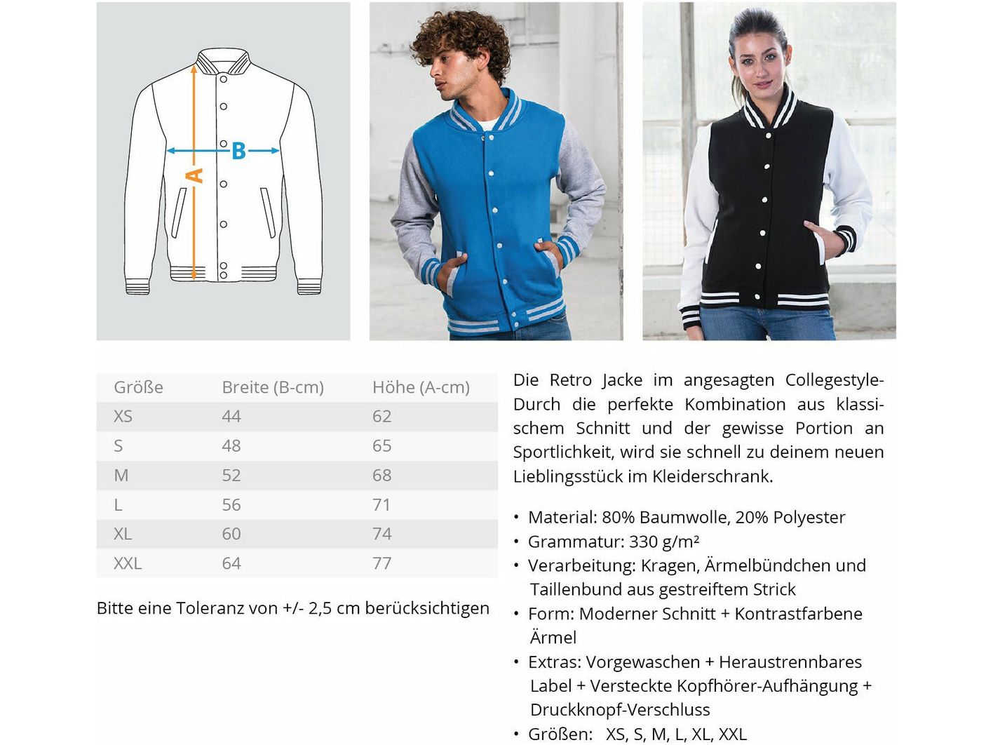 Dieses coole Motiv ist eine tolle Alternative zum alltäglichen Standard. Die Collegejacke eignet sich außerdem perfekt als Geschenk. Wir bieten Qualitätsware auf höchstem Niveau. College Sweatjacke mit kontrastfarbenen Ärmeln und versteckter Kopfhörer-Aufhängung. Nach erfolgter Bestellung wird dein Produkt exklusiv für dich unmittelbar produziert und innerhalb zwei Werktagen versendet. Somit erhält jeder Kunde ein Einzelstück und wir schonen ganz nebenbei noch die Umwelt, da wir nur dann produzieren wenn eine Bestellung des Produktes erfolgt.