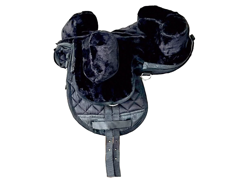 Ober- und Untermaterial bestehen aus pflegeleichtem Kunstfell. Die dazwischenliegende, an der Unterseite fest vernähte Satteldecke ist robust und strapazierfähig. Das obere Kunstfell kann mittels Reißverschlusses leicht abgenommen werden, sodass die darunterliegende Satteldecke auch zum Reiten genutzt werden kann.